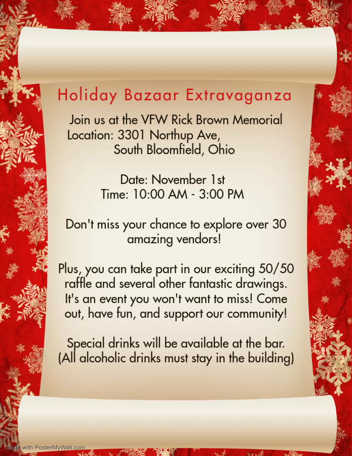 Join us at the VFW Rick Brown Memorial, located at 3301 Northup Ave, South Bloomfield, Ohio. Don’t miss your chance to explore over 30 amazing vendors! Plus, you can take part in our exciting 50/50 raffle and several other fantastic drawings. It’s an event you don’t want to miss! Come out, have fun, and support our community! Special drinks will be available at the bar.