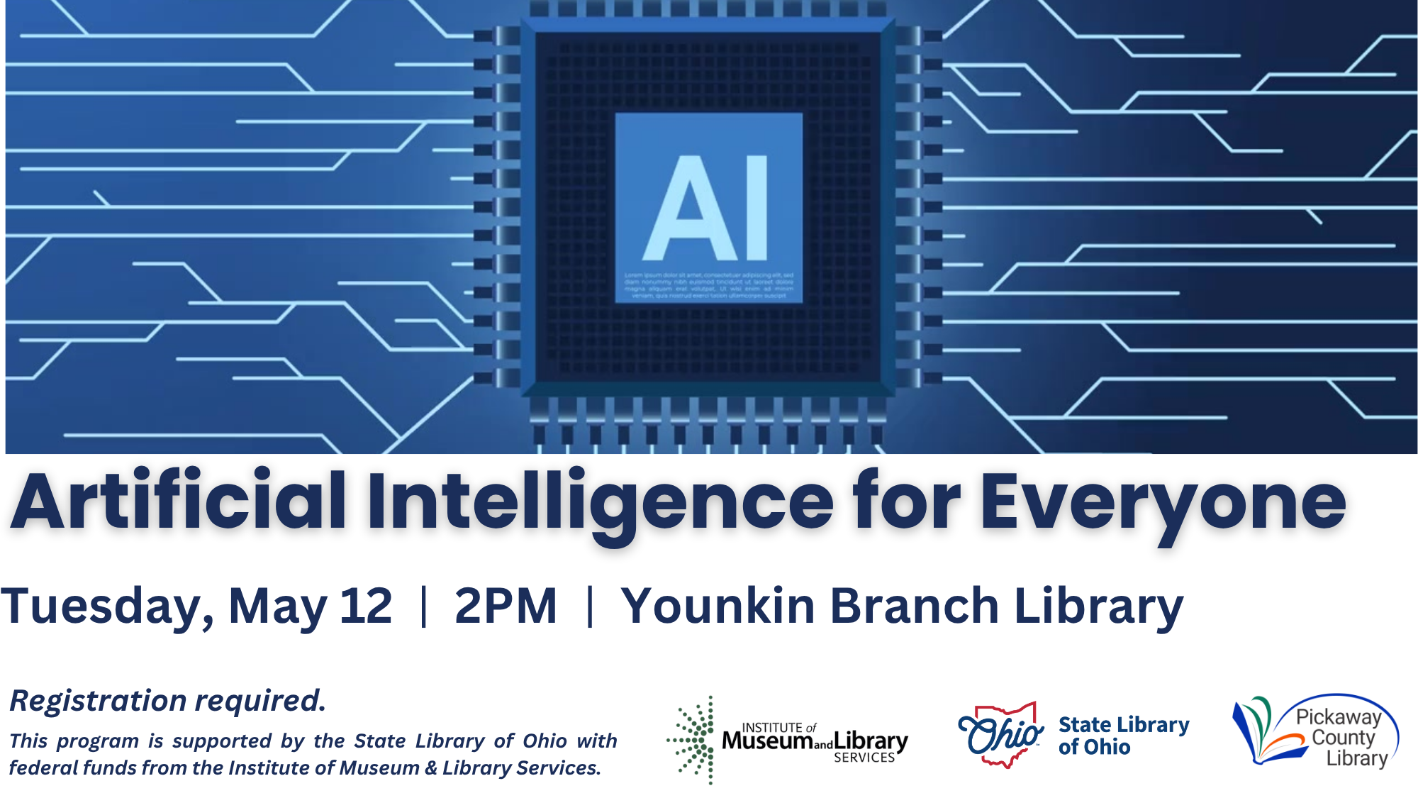 May 12 Artificial Intelligence for Everyone 2:00 pm Floyd E. Younkin Branch, Pickaway County Library 51 Long St., Ashville Event Details Get Directions